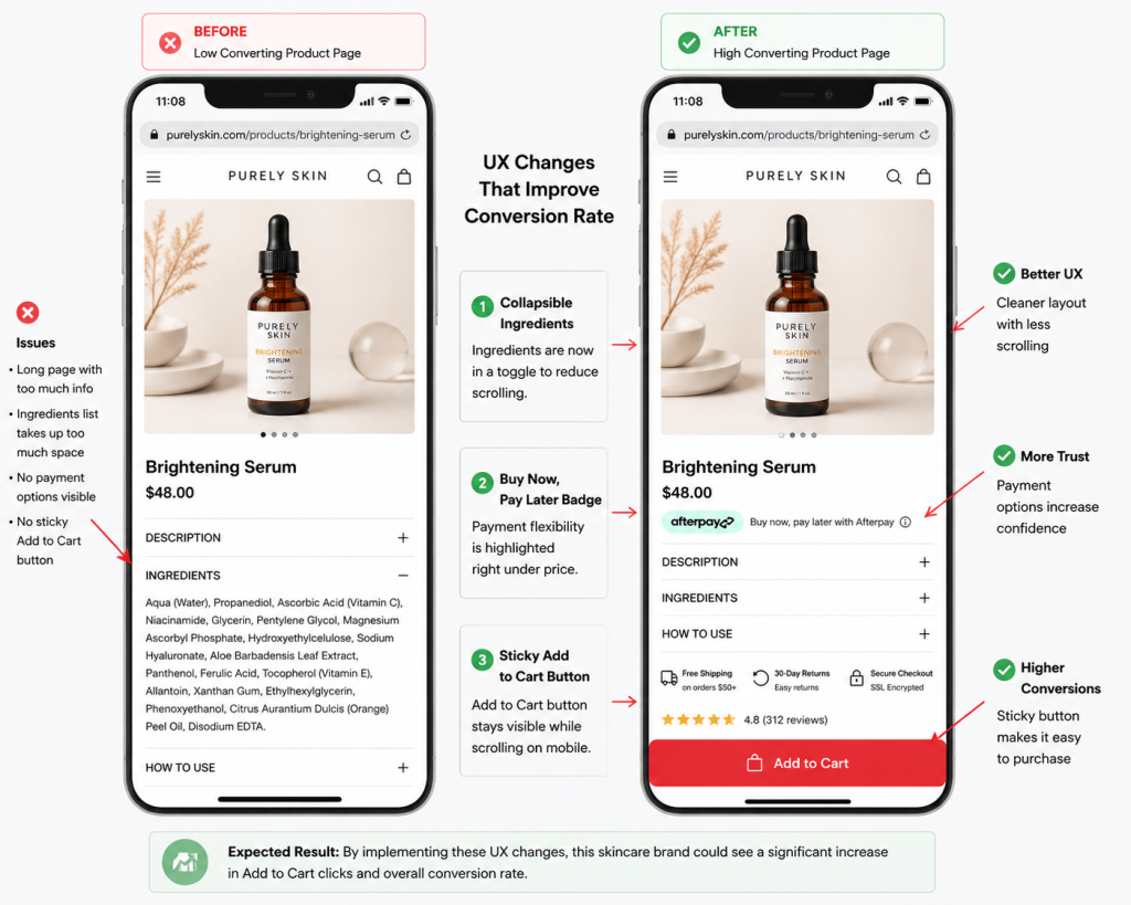 With fewer distractions and clearer purchase signals, users can navigate the page more confidently. In many ecommerce scenarios, reducing scrolling friction and improving visibility of key actions leads to measurable improvements in engagement and sales. This example highlights how thoughtful UX adjustments can help turn hesitant visitors into paying customers.