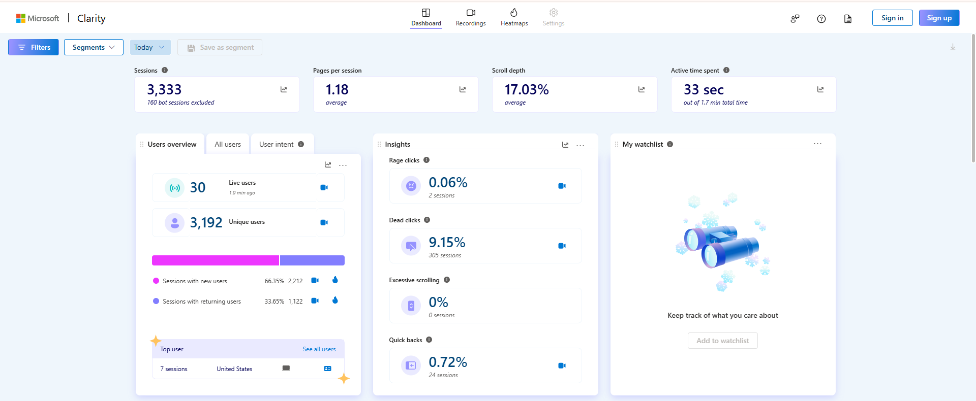 • Microsoft Clarity: A powerful, free tool that offers heatmaps and recordings with no session limits. It’s an excellent starting point for new merchants.